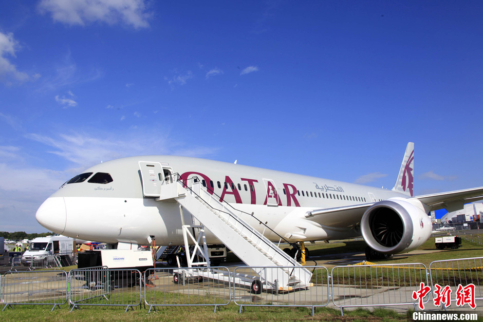 當(dāng)?shù)貢r(shí)間7月8日,第48屆英國(guó)范堡羅航展開幕在即,全球航空企業(yè)及各類飛機(jī)均已趕到航展現(xiàn)場(chǎng)。圖為參展的波音787夢(mèng)想客機(jī)。中新社發(fā) 孫自法 攝