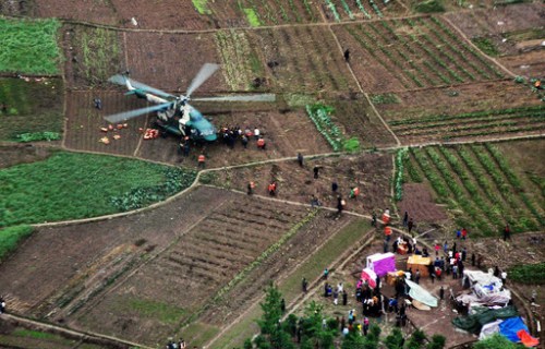 成都軍區(qū)空軍出動(dòng)直升機(jī)對(duì)寶盛鄉(xiāng)進(jìn)行大規(guī)?者\(yùn)空投(曹憶楠 攝)