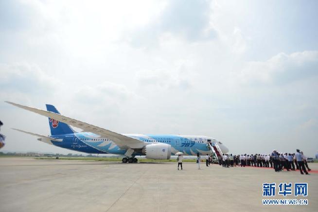 6月2日,南方航空公司在廣州白云機(jī)場舉辦接機(jī)儀式,宣布中國引進(jìn)的首架波音787夢想飛機(jī)正式啟動(dòng)運(yùn)營。當(dāng)日,我國引進(jìn)的首架波音787夢想飛機(jī)飛抵廣州。 新華社記者 王建華 攝