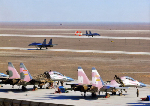 解放軍廣空部隊粉色涂裝蘇-30MKK假想敵戰(zhàn)機部隊在西北基地與殲11戰(zhàn)機對抗訓練照曝光。