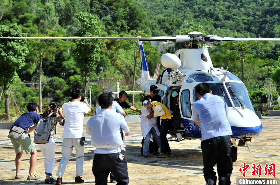 8月27日,深圳市公安局交警支隊(duì)在大鵬新區(qū)西涌舉行突發(fā)交通事故應(yīng)急演練。演練模擬該地區(qū)車流量大,發(fā)生事故后該路段出現(xiàn)擁堵,處置和救援人員無(wú)法進(jìn)入事故現(xiàn)場(chǎng),急調(diào)警用直升機(jī)飛赴事故現(xiàn)場(chǎng)進(jìn)行處置,轉(zhuǎn)移救治“傷員”。中新社發(fā) 陳文 攝