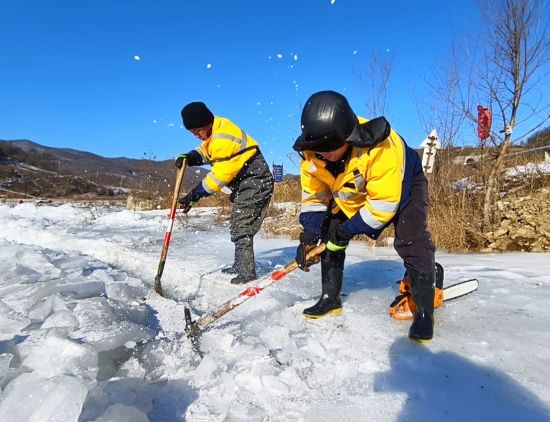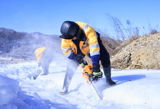作業(yè)人員使用油鋸切開河道內(nèi)冰面,作為上游流水的引水槽。