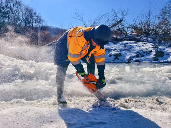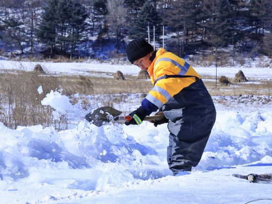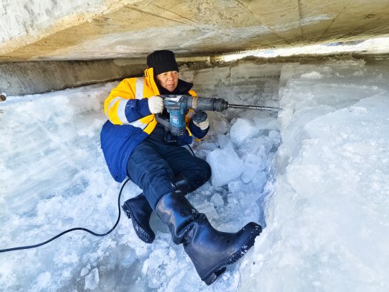 2月初的北方山區(qū),寒風(fēng)呼嘯,風(fēng)力達(dá)五級(jí),氣溫逼近零下20攝氏度。職工們手持油鋸、電鎬破開冰層,由于橋下空間有限,職工們有時(shí)需要半跪或是半躺式,一層層的進(jìn)行破冰,然后再用鐵鍬將碎冰鏟至河道兩側(cè)。冰水混合物不斷濺到身上,迅速凝結(jié)成冰,不到半小時(shí),許多人外套已覆上一層白霜,成了名副其實(shí)的“冰人”。然而無人停歇,破冰動(dòng)作穩(wěn)健而持續(xù)。
