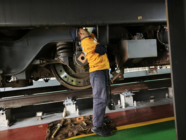隨著2026年春運(yùn)開啟,線上普速高鐵南來北往越加頻繁,運(yùn)力全開,高強(qiáng)度運(yùn)營(yíng)也讓機(jī)車出檢修庫(kù)的頻率隨之增長(zhǎng)。剛踏入檢修庫(kù),濃烈的柴油味便撲面而來,檢修錘敲擊大機(jī)部件的叮當(dāng)聲、扳手?jǐn)Q緊螺栓的悶響、設(shè)備調(diào)試的蜂鳴聲交織回蕩。身著工裝的檢修人員或攀上車頂或鉆入車底,衣角浸著淡淡的油跡——那是連日檢修留下的工作印記。人群之中只見一抹橘黃斜挎工具包,將紅旗一插,靈活游走于車上車下,日均過萬的步數(shù),熟練運(yùn)用攜帶的儀器儀表,記錄設(shè)備參數(shù),為鋼鐵巨龍擦亮“眼睛”,校準(zhǔn)“神經(jīng)”。