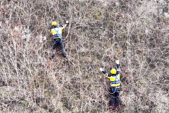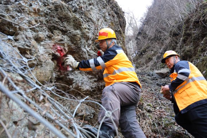 “壁虎兄弟”們手腳并用沿防護(hù)網(wǎng)向上攀爬檢查,作業(yè)服很快被汗水與融雪浸濕,如壁虎般懸空貼壁,近距離探查危石狀態(tài)、檢查防護(hù)網(wǎng)、精準(zhǔn)測量數(shù)據(jù),哪怕手臂酸痛、雙腿發(fā)軟,哪怕寒風(fēng)刮得臉頰生疼,也始終一絲不茍、精益求精。