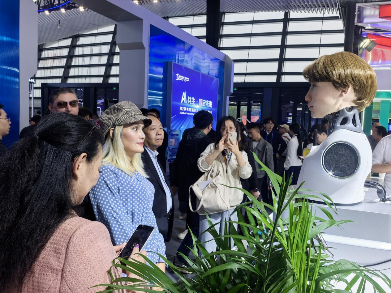 觀眾與松延動力仿生機器人互動,這款自主研發(fā)的仿生機器人可實時識別并模仿互動對象的各種面部表情。中國經濟網記者郭文培/攝
