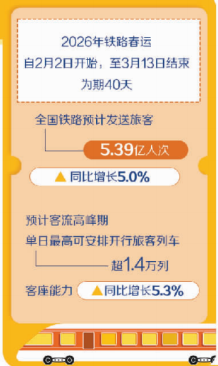 2026年鐵路春運自2月2日開始,至3月13日結束,為期40天,全國鐵路預計發(fā)送旅客5.39億人次、同比增長5.0%,節(jié)前客流高峰日預計為2月13日(農歷臘月廿六),節(jié)后客流高峰日預計為2月23日(農歷正月初七)。