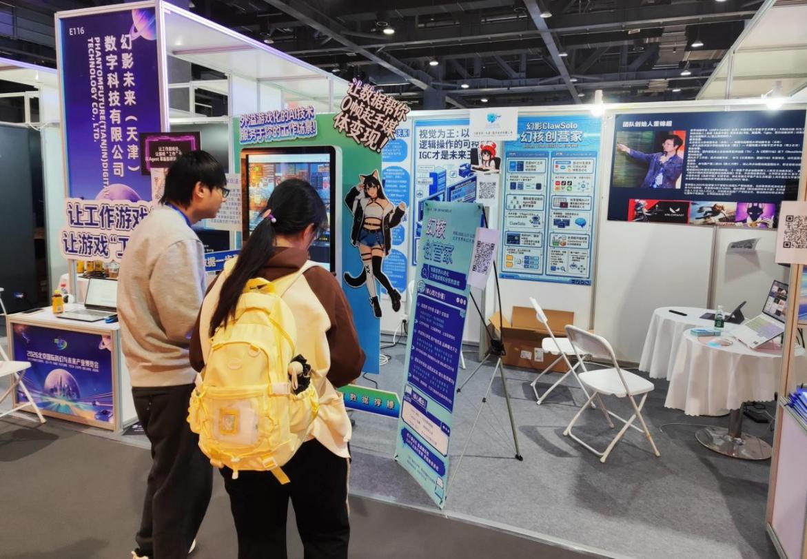 展館內(nèi),幻影未來(天津)數(shù)字科技有限公司的展位上顯示著像素風格的辦公室界面,吸引著觀眾駐足?!拔覀兪褂脭?shù)字人和像素風辦公室界面作為前端,讓用戶和Agent互動更為直接簡單,真正實現(xiàn)‘工作變得像游戲一樣簡單’?!倍\超介紹,幻影未來是一家游戲與動畫垂類的技術(shù)型“OPC”,目前專注于AI Agent智能體技術(shù)自動化應(yīng)用,包含影視動畫、游戲交互、泛娛樂等,今年主打的核心產(chǎn)品是面向C端和小B端的ClawSolo項目。董錦超透露,除該項目外,他們深耕游戲和動畫垂類,與一些大廠達成長期合作開發(fā),與AI短劇平臺做聯(lián)合出品和制片任務(wù)。
