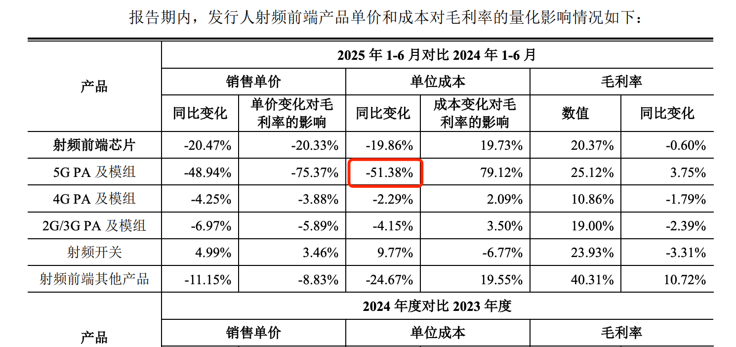 根據(jù)昂瑞微在二輪問詢回復(fù)中披露的數(shù)據(jù),2025年上半年,其5G PA及模組的銷售單價同比大幅下滑36%。射頻前端芯片從2023年、2024年到2025年上半年,單價分別是1.53、1.24和1.08,降幅分別為19%和13%,其中5G PA及模組,單價分別為3.30、3.21和2.04,降幅分別為3%和36%。
