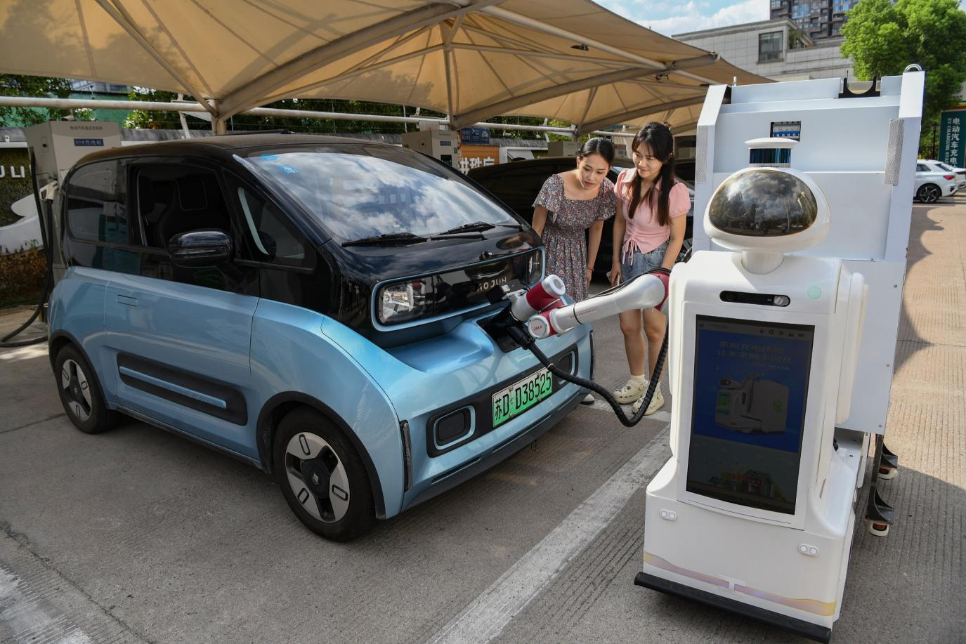 新能源車主在金華市金東區(qū)光南充電站體驗(yàn)儲(chǔ)能式可移動(dòng)智能機(jī)器人自助充電服務(wù)。(周寧/攝)