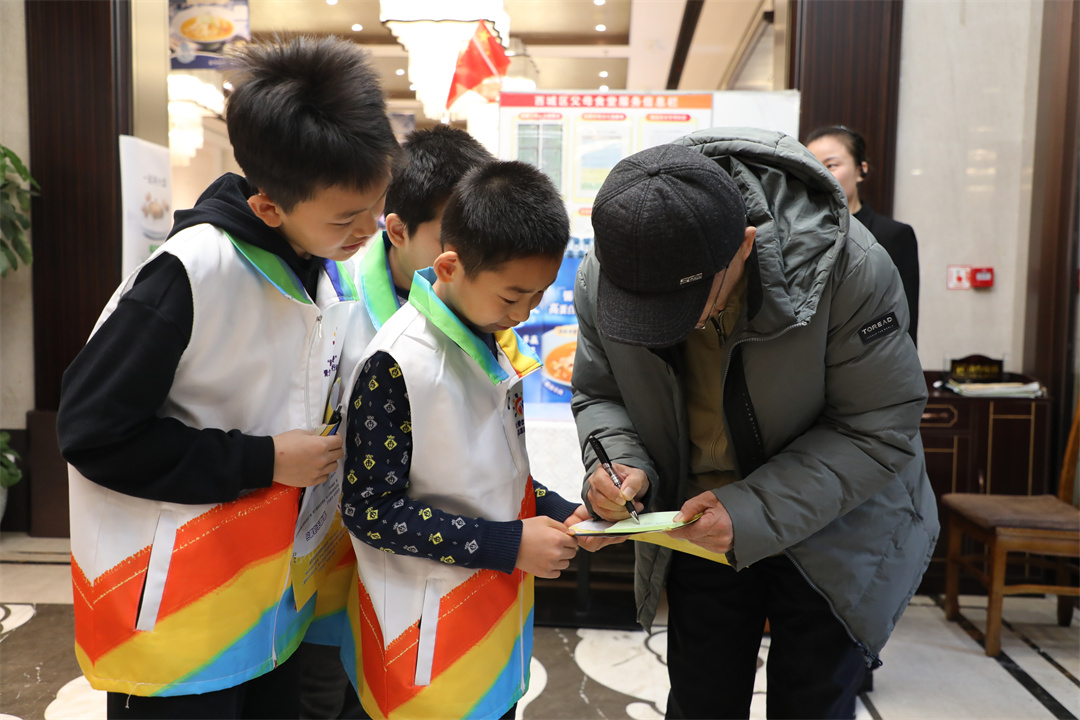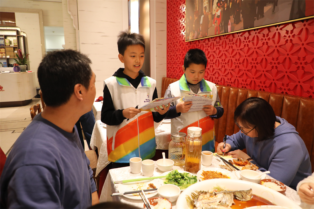 志愿者們還學以致用,化身“制止餐飲浪費宣傳員”,向餐廳中的食客宣傳節(jié)糧反浪費知識,發(fā)放節(jié)糧知識宣傳單,并邀請食客寫下自己節(jié)約糧食和避免浪費的心得。在店食客積極參與留言并對小志愿者的宣講表示認同。