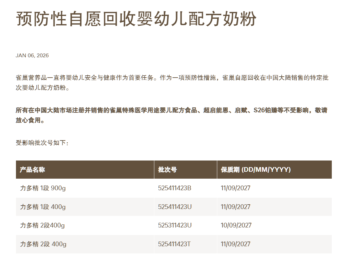 1月6日,雀巢大中華區(qū)官方網(wǎng)站發(fā)布兩則《預(yù)防性自愿回收嬰幼兒配方奶粉》公告。一份公告針對(duì)在中國(guó)大陸銷售的特定批次嬰幼兒配方奶粉,涉及力多精、鉑初能恩、舒宜能恩以及惠氏膳兒加兒童成長(zhǎng)奶粉等30批次產(chǎn)品。另一份公告則針對(duì)所有此次涉事的進(jìn)口自歐洲、在中國(guó)大陸跨境電商渠道銷售的嬰幼兒配方奶粉,涉及“Nestlé BEBA Supreme”“惠氏Wyeth啟賦未來(lái)”等41批次產(chǎn)品。