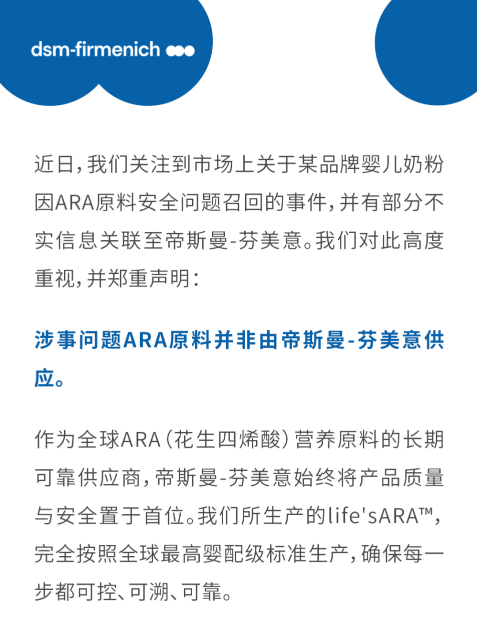 帝斯曼-芬美意人類營(yíng)養(yǎng)與關(guān)愛(ài)事業(yè)部的官方公眾號(hào)“帝斯曼芬美意營(yíng)養(yǎng)365”發(fā)布聲明《嚴(yán)正聲明:近日涉事問(wèn)題ARA原料并非由帝斯曼-芬美意供應(yīng)》的截圖。