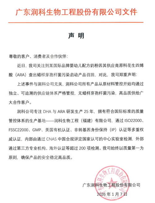 同日,廣東潤(rùn)科生物工程股份有限公司也發(fā)布聲明稱,召回事件與潤(rùn)科公司無(wú)關(guān),潤(rùn)科公司所有產(chǎn)品從原材料管控開(kāi)始均通過(guò)獨(dú)立、可追溯的供應(yīng)鏈體系嚴(yán)格管控,無(wú)蠟樣芽孢桿菌污染。