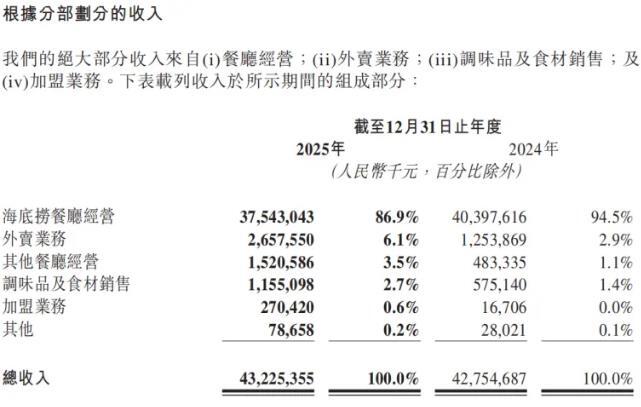 值得注意的是,海底撈的核心板塊餐廳經(jīng)營業(yè)務出現(xiàn)增長瓶頸。財報顯示,海底撈餐廳經(jīng)營收入從2024年的403.98億元降至375.43億元,同比減少7.1%,占總營收比重也從94.5%收縮至86.9%。