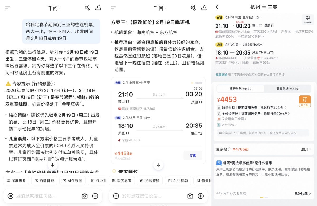 例如,用戶可以讓千問App幫助規(guī)劃春節(jié)旅行計劃。在預定機票的環(huán)節(jié),用戶可以輸入“幫我定春節(jié)期間到三亞的往返機票,兩大一小,三亞停留四天,出發(fā)時間是2月18日或者19日。”千問能夠調(diào)用飛豬服務,綜合分析春運票價走勢,給出不同策略的航班方案。