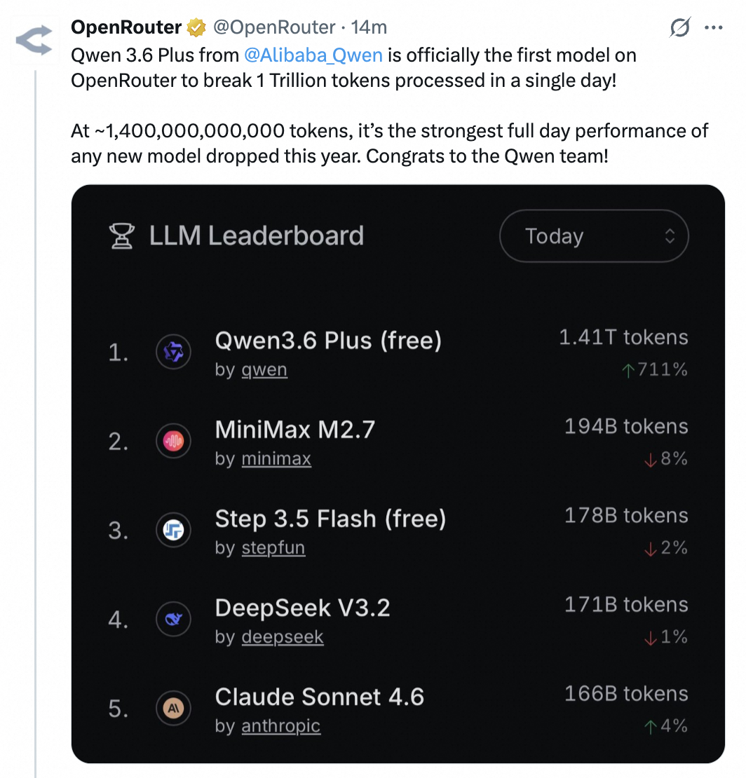 OpenRouter社媒官宣截圖,稱Qwen3.6-Plus破紀錄,是“最強勁的新模型表現”