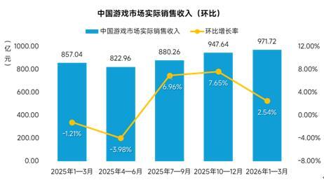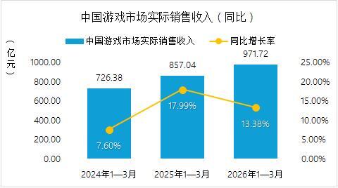 近日,伽馬數(shù)據(jù)發(fā)布了《2026年1—3月中國(guó)游戲產(chǎn)業(yè)月度報(bào)告》(以下簡(jiǎn)稱報(bào)告),報(bào)告顯示: 2026年1—3月,中國(guó)游戲市場(chǎng)實(shí)際銷售收入為971.72億元,環(huán)比增長(zhǎng)2.54%,同比增長(zhǎng)13.38%。