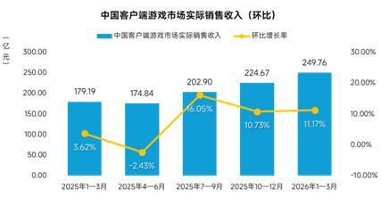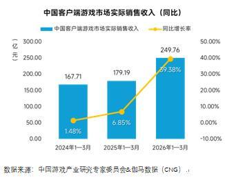 2026年1—3月,中國(guó)客戶端游戲市場(chǎng)實(shí)際銷售收入為249.76億元,環(huán)比增長(zhǎng)11.17%,同比增長(zhǎng)39.38%,增速領(lǐng)先于整體市場(chǎng),成為本季度市場(chǎng)增長(zhǎng)的核心引擎。