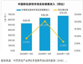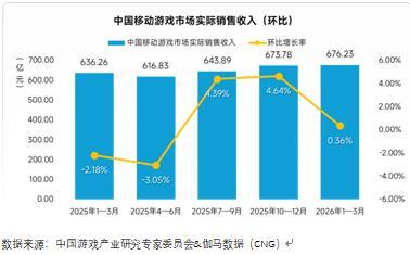 2026年1—3月,中國(guó)移動(dòng)游戲市場(chǎng)實(shí)際銷售收入為676.23億元,環(huán)比增長(zhǎng)0.36%,同比增長(zhǎng)6.28%。