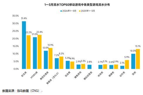 2026年1—3月,移動(dòng)游戲流水TOP50中,射擊類流水份額從去年同期的22.2%提升至31.4%,成為增長(zhǎng)最突出的品類。其中,《和平精英》保持用戶基本盤并實(shí)現(xiàn)同比增長(zhǎng),《三角洲行動(dòng)》流水同比增幅超500%,次新游《無(wú)畏契約:源能行動(dòng)》《逆戰(zhàn):未來(lái)》也貢獻(xiàn)了增量。