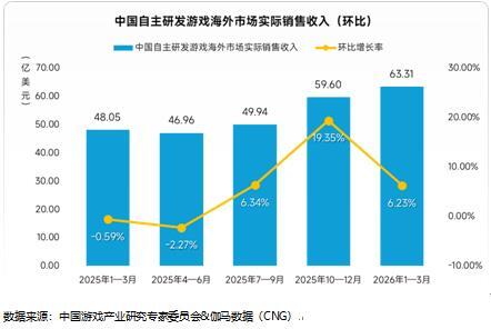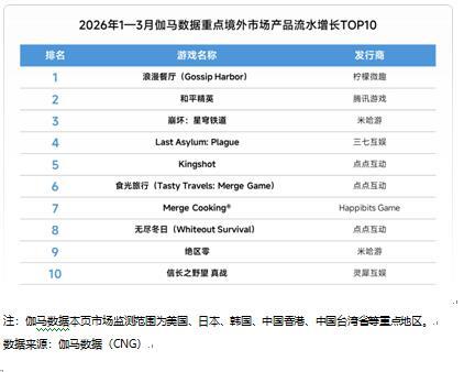 2026年1—3月,中國(guó)自主研發(fā)游戲海外市場(chǎng)實(shí)際銷售收入為63.31億美元,環(huán)比增長(zhǎng)6.23%,同比增長(zhǎng)31.76%。同比市場(chǎng)表現(xiàn)則主要由多款在海外市場(chǎng)取得成功的產(chǎn)品所驅(qū)動(dòng),包括《Kingshot》《浪漫餐廳》(Gossip Harbor)《Last Z: Survival Shooter》《食光旅行》(Tasty Travels: Merge Game)《心動(dòng)小鎮(zhèn)》等,為海外市場(chǎng)收入貢獻(xiàn)了增量。