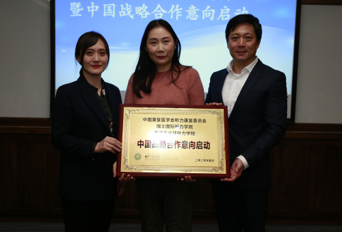 索諾瓦聽力集團中國區(qū)董事、總經(jīng)理張衛(wèi)(左)與中國康復醫(yī)學會聽力康復專業(yè)委員會秘書長王立群(中)等共同啟動中國戰(zhàn)略合作意向