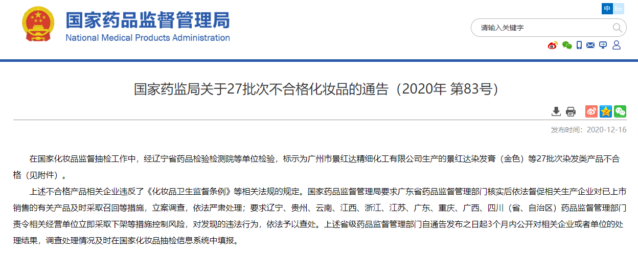 在國家化妝品監(jiān)督抽檢工作中,經(jīng)遼寧省藥品檢驗檢測院等單位檢驗,標示為廣州市景紅達精細化工有限公司生產(chǎn)的景紅達染發(fā)膏(金色)等27批次染發(fā)類產(chǎn)品不合格。
