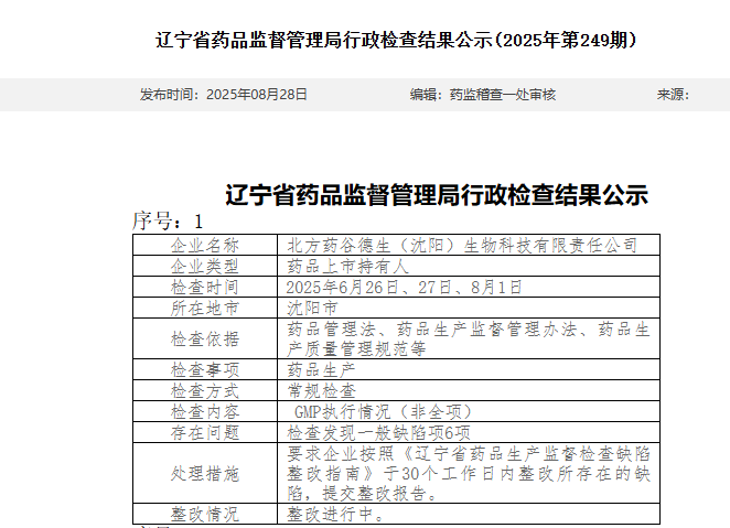 中國(guó)經(jīng)濟(jì)網(wǎng)9月1日訊 日前,遼寧省藥品監(jiān)督管理局公示多則行政檢查結(jié)果信息。其中,在對(duì)北方藥谷德生(沈陽(yáng))生物科技有限責(zé)任公司GMP執(zhí)行情況檢查中,發(fā)現(xiàn)該公司存在一般缺陷項(xiàng)6項(xiàng)。對(duì)此,遼寧省藥品監(jiān)督管理局要求該公司按照《遼寧省藥品生產(chǎn)監(jiān)督檢查缺陷整改指南》于30個(gè)工作日內(nèi)整改所存在的缺陷,提交整改報(bào)告。目前,該公司整改進(jìn)行中。