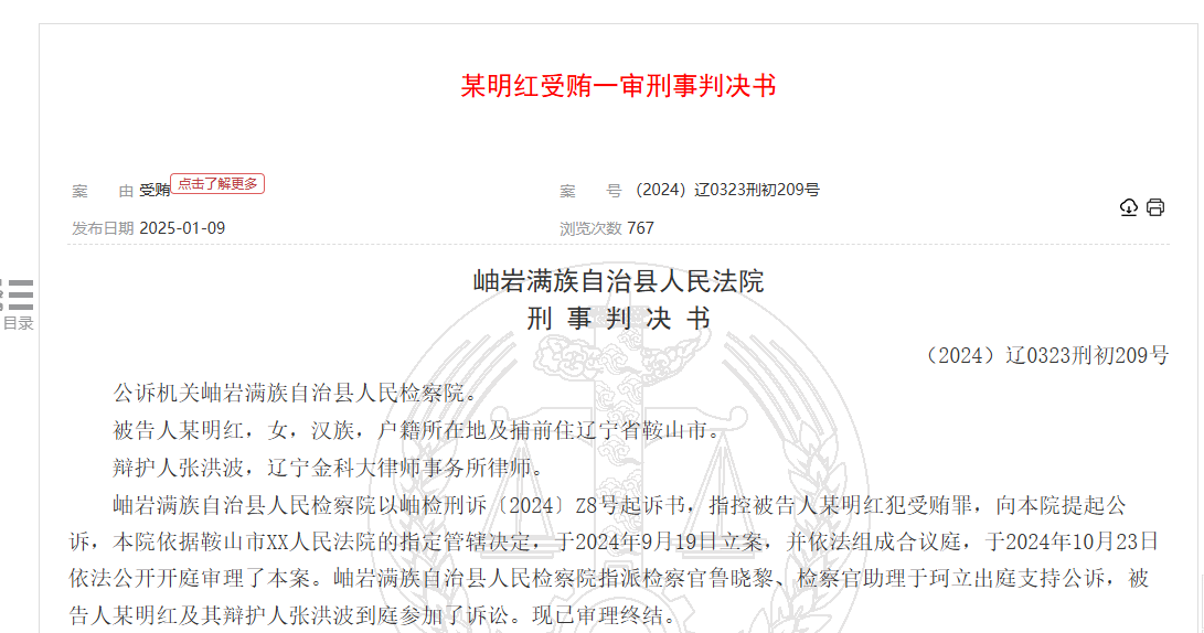 根據(jù)判決書,2015年7月至2018年12月,被告人某明紅利用其擔(dān)任藥劑科主任的職務(wù)便利,接受“李某2”請托,為“李某2”代理的昆藥集團(tuán)血塞通(凍干)、武漢人福藥業(yè)有限公司生產(chǎn)的小牛血去蛋白提取物注射液進(jìn)入醫(yī)院銷售及奧硝唑氯化鈉注射液在釆購系統(tǒng)內(nèi)進(jìn)行廠家更名等方面提供幫助,并每月在其辦公室內(nèi),收受“李某2”所送錢款共計20萬元。
