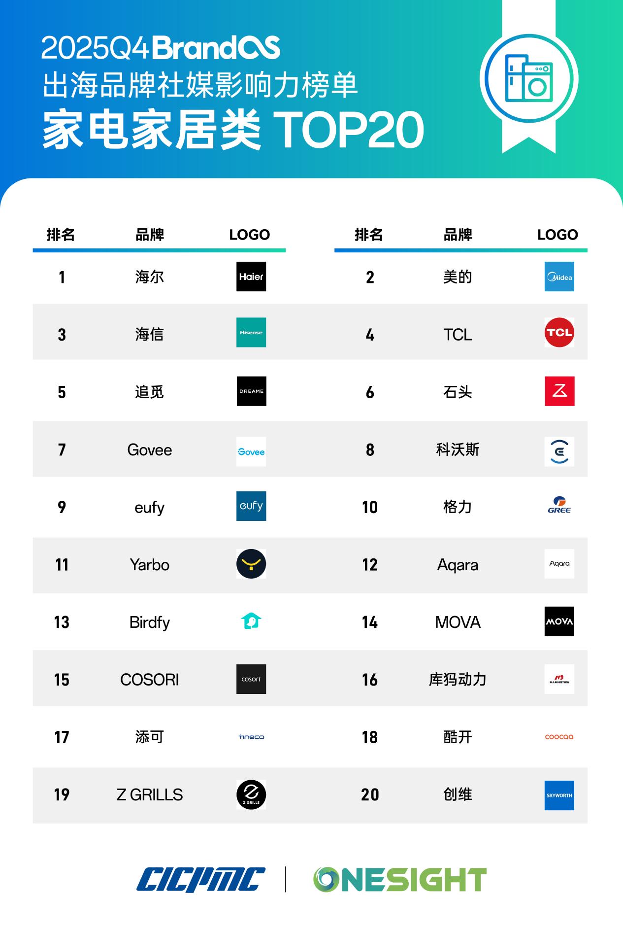 1月20日,2025Q4《BrandOS出海品牌社媒影響力榜單》正式揭曉。該榜單以“數據公開透明性+行業(yè)適配性”為核心原則,提供覆蓋消費電子、汽車、家電家居、新能源、智能制造等8大核心領域的榜單,直觀反映品牌在全球化進程中的階段性成果。