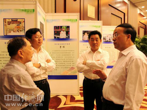 2013年全國(guó)食品安全宣傳周啟動(dòng)儀式暨第五屆中國(guó)食品安全論壇6月17日在北京舉辦,今年主題為“社會(huì)共治 同心攜手維護(hù)食品安全”。圖為論壇嘉賓中國(guó)工程院院士陳君石(左一)、國(guó)家食品藥品監(jiān)督管理總局副局長(zhǎng)滕佳材(左二)、國(guó)家食品藥品監(jiān)督管理總局副局長(zhǎng)劉佩智(右二)、蘭州市市長(zhǎng)袁占亭(右一)進(jìn)行交流。 中國(guó)經(jīng)濟(jì)網(wǎng) 王耀峰/攝