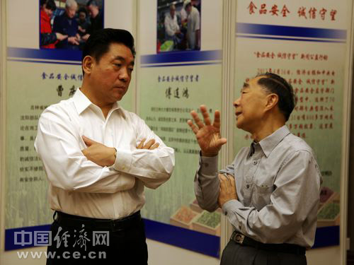 2013年全國(guó)食品安全宣傳周啟動(dòng)儀式暨第五屆中國(guó)食品安全論壇6月17日在北京舉辦,今年主題為“社會(huì)共治 同心攜手維護(hù)食品安全”。圖為食品藥品監(jiān)管總局副局長(zhǎng)劉佩智(左)和中國(guó)工程院院士陳君石參觀食品安全“誠(chéng)信守望者”展覽。中國(guó)經(jīng)濟(jì)網(wǎng) 王耀峰/攝